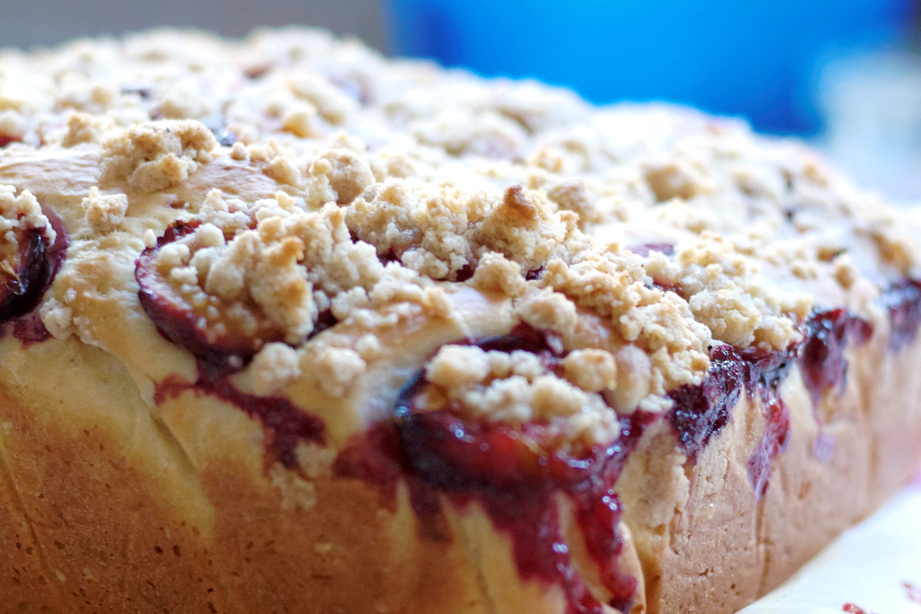 Gdy ciasto wyrośnie, około dwukrotnie, przelewamy je do formy (30-40cm powinna być ok). Wyłożyć owocami np. śliwkami, rabarbarem, porzeczkami. W przypadku śliwek dobrze jest przeciąć je na pół i układać skórką na dół. Posypać kruszonką i odstawić na około 30 minut ,aż lekko podrośnie. W tym czasie rozgrzać piekarnik do 180 stopni. Piec około 50 minut, aż się kruszonka zrumieni, a kijek lub wykałaczka wetknięty w ciasto i wyjęty będą suche 🙂 Każdy piekarnik jest inny, więc sposób pieczenia może być różny, i najlepiej sprawdzac stan ciasta organoleptycznie.