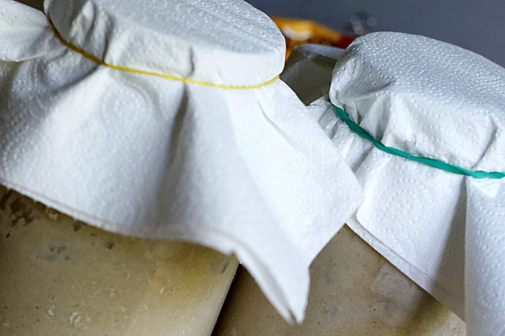I ostatnia sprawa. Ponieważ zakwas trzymam w lodówce (spowalnia to procesy fermentacyjne i wydłuża przydatność zakwasu) zawsze staram się go dokarmiać po ogrzaniu, 1-2 godziny po wyjęciu. Szybciej ruszy i będzie gotowy do przyrządzenia zaczynu. Po użyciu wraca od razu do lodówki. W lodówce mieszka w słoiku, przykryty ręcznikiem papierowym. Najlepiej do tego się nadaje słoik o szerokim otworze, tak aby łatwiej było dokarmiać i mieszać.